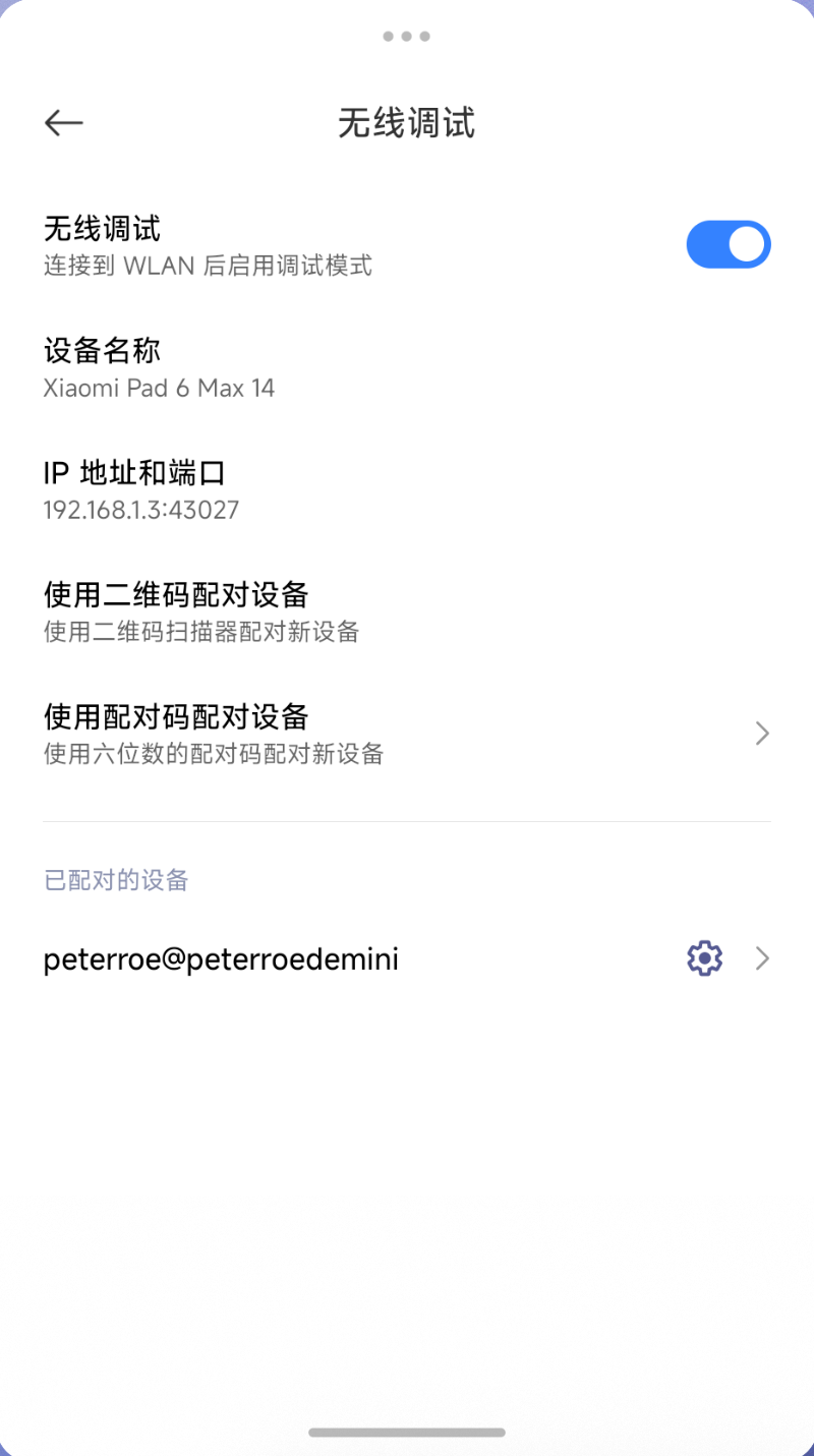 打开开关后,可以查看当前设备提供的无线连接方式的 IP 和端口,我这里是 192.168.1.3:43027