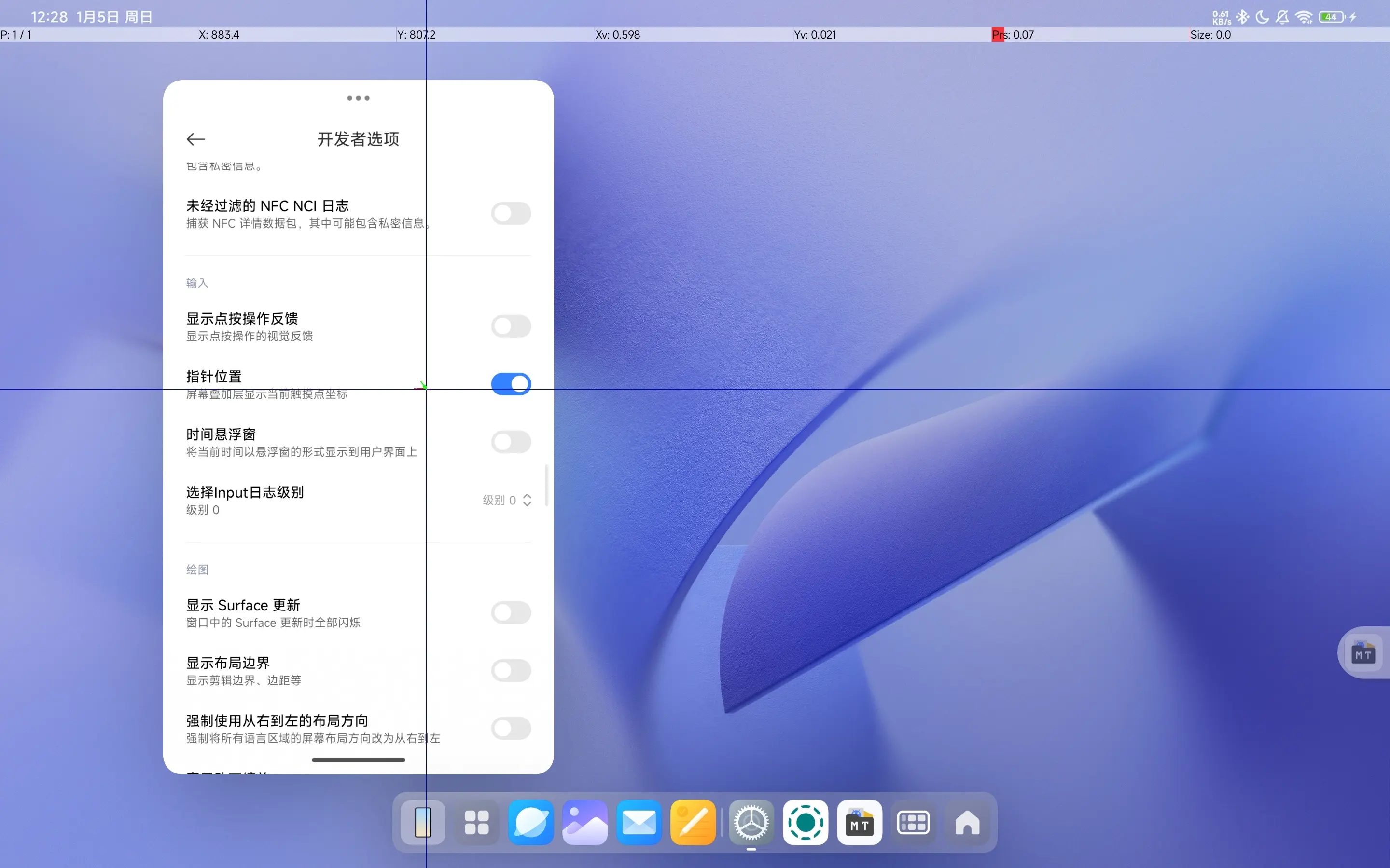 坐标获取方式,在开发者模式下,打开「指针位置」,然后点击屏幕,可以看到当前的坐标