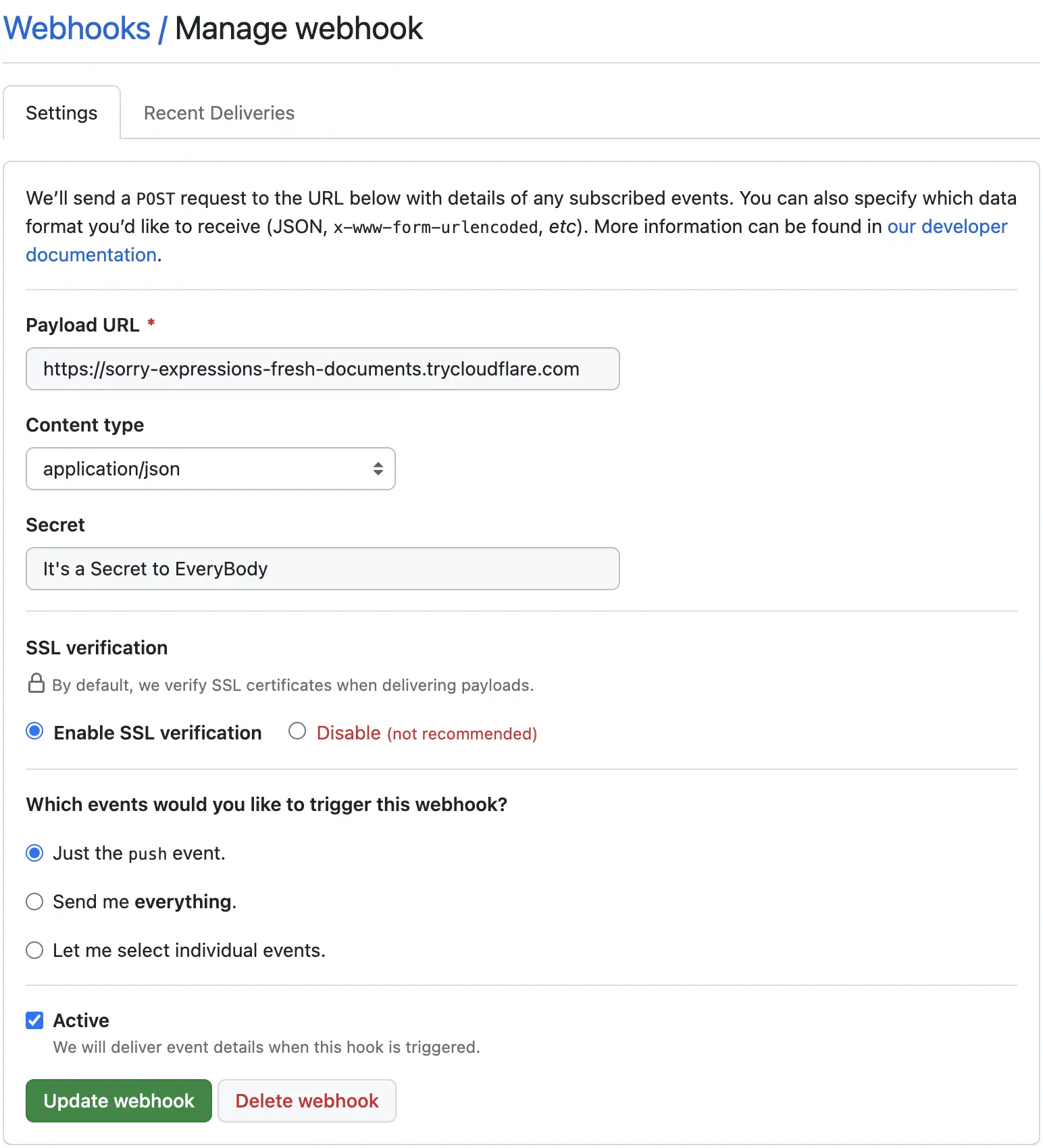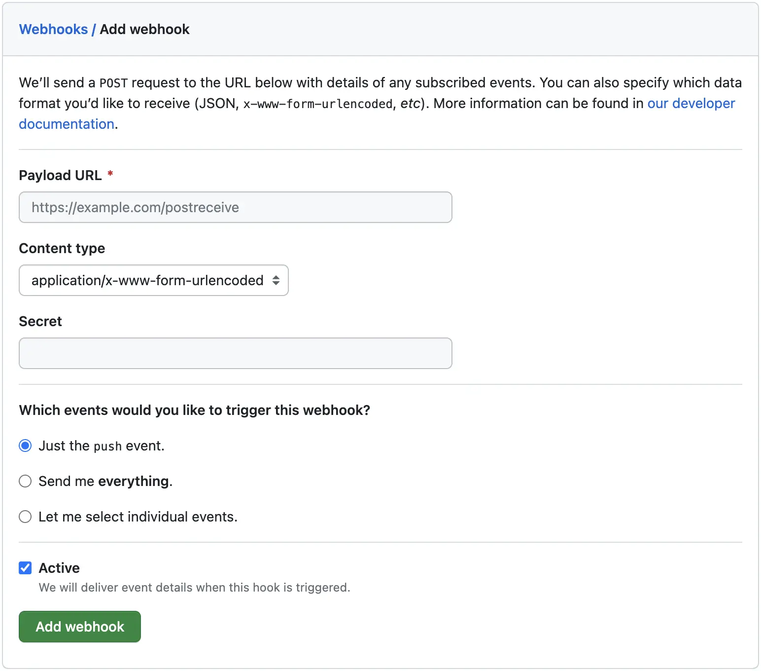 Content type 是消息的类型,Secret 是自定义的密钥,用于确保这个请求的客户端来自 Github,而不是恶意请求的用户