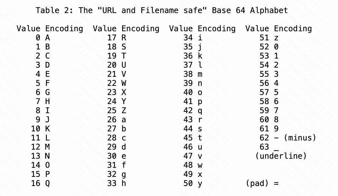 根据 RFC4648 描述,在 URL 安全的 Base64 编码中,将 + 替换为中划线 -,将 / 替换为下划线 _,所以我们有第二张编码表: