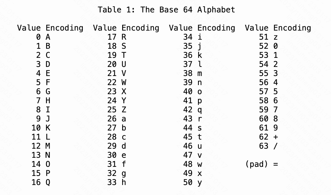 通过 Base64 编码的出来的文本只包含 a-z、A-Z、0-9、+、/,共 26 + 26 + 10 + 2 等于 64 个字符,这就是为什么它被称为 Base64
