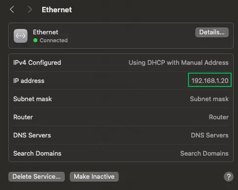 找到 Ethernet,IPv4 Configured 选择 Use DHCP with Manual Address,我这里设置的是 192.168.1.20,避免 IP 冲突