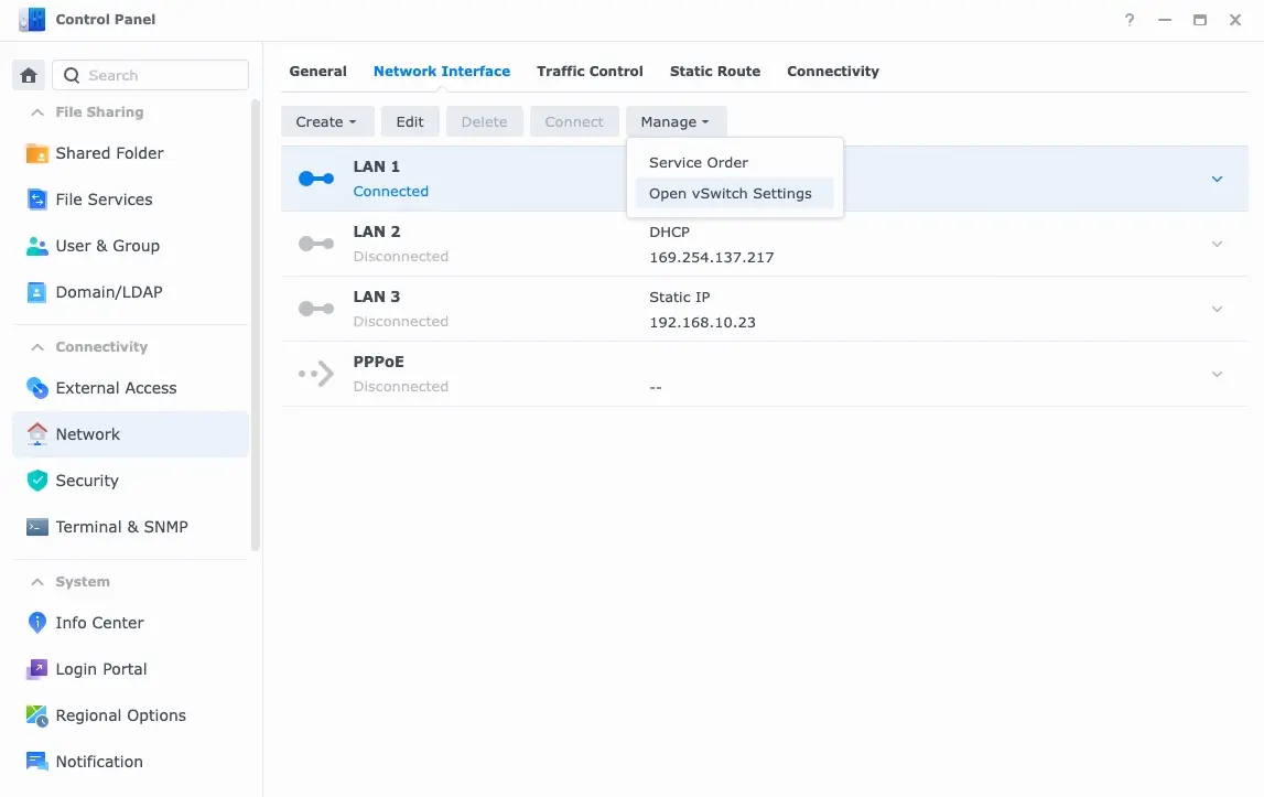 如果有实际的物理交换机,可以直接用物理机连接主力机。假设只有一根网站,可以使用虚拟交换机功能,群辉的 Nas 直接内置了,打开下面这个选项即可