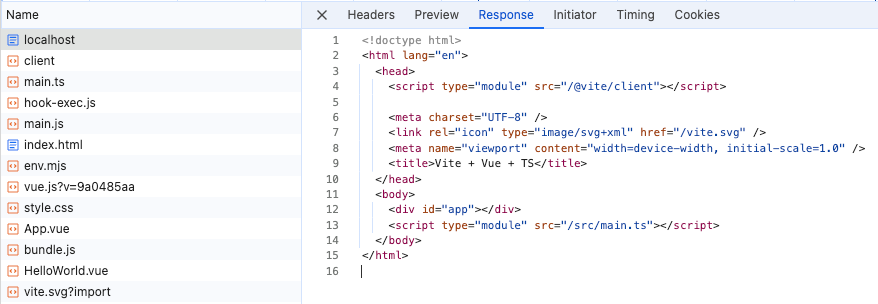 我们逐步分享浏览器的请求,以及 vite 服务器的响应,首先,浏览器向服务器请求根路径 http://localhost:5173